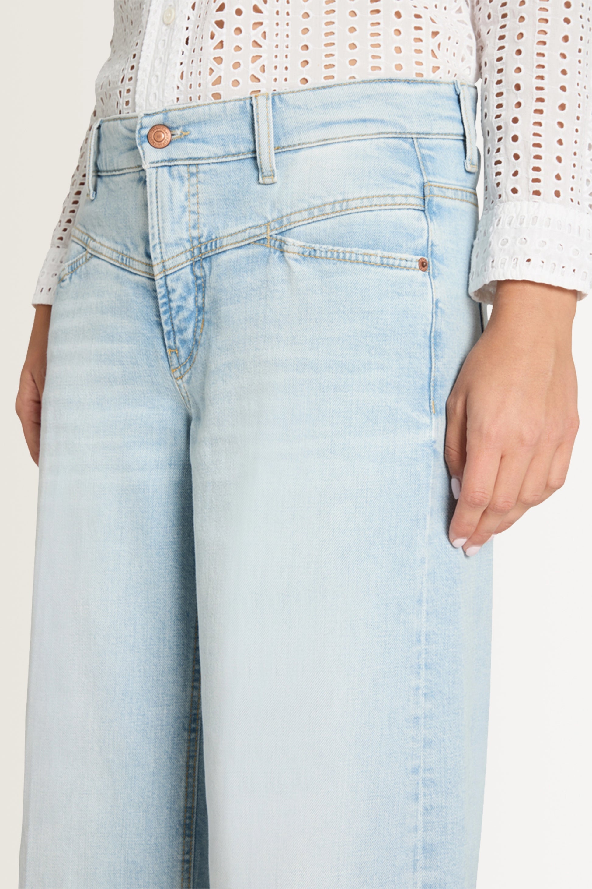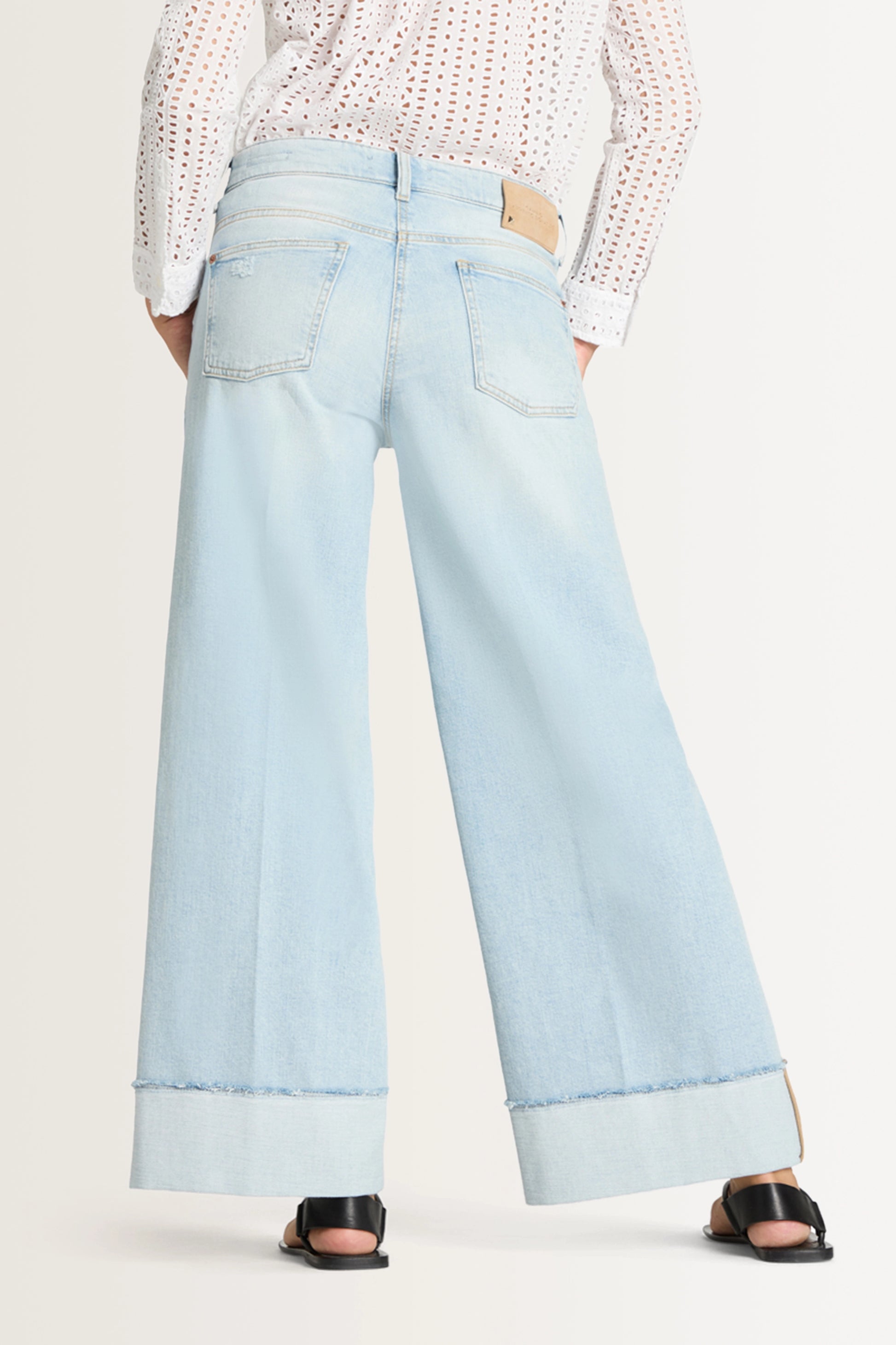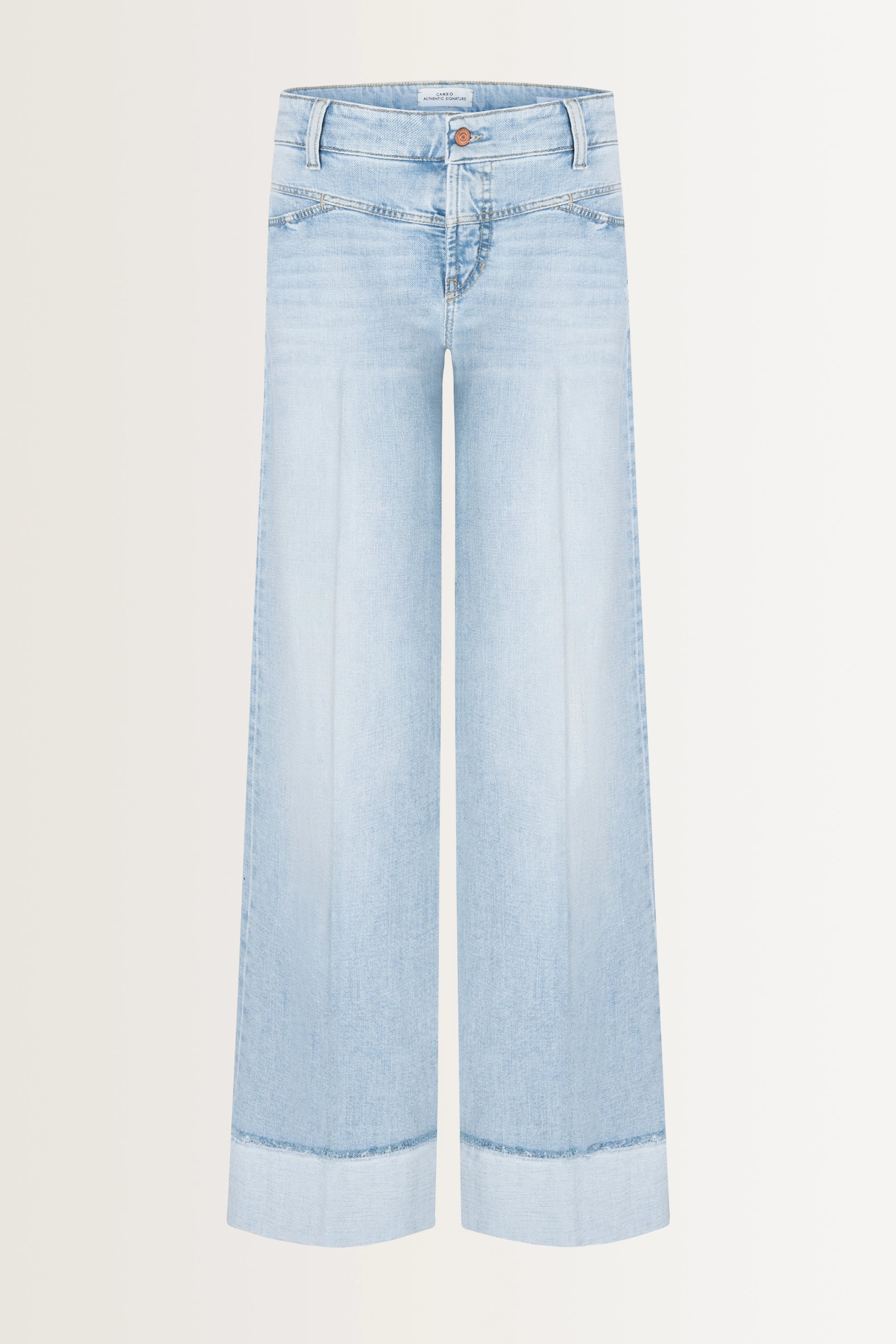 Lichtblauwe denim broek van Cambio met een wijde pijp en een moderne, vrouwelijke uitstraling. Dit model heeft een normale taille, valt tot op de enkel en is uitgevoerd met een rits- en knoopsluiting, achterzakken en een subtiele stretch voor extra comfort. De brede omslag aan de zoom geeft deze broek een eigentijdse look.