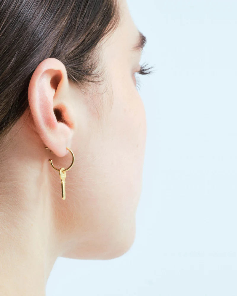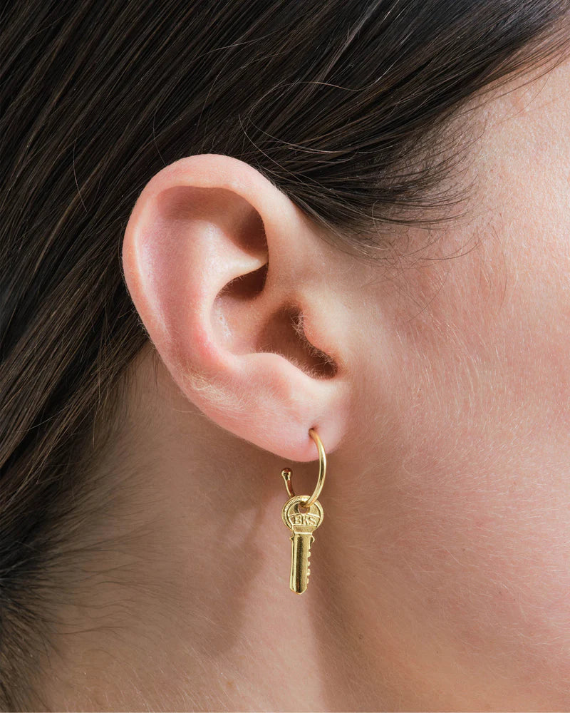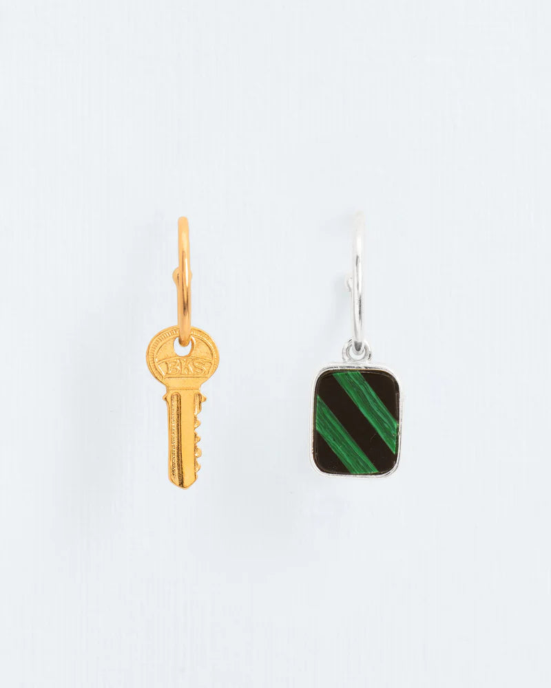 Asymmetric hoop earrings with key and malachite and onyx mosaic pendants