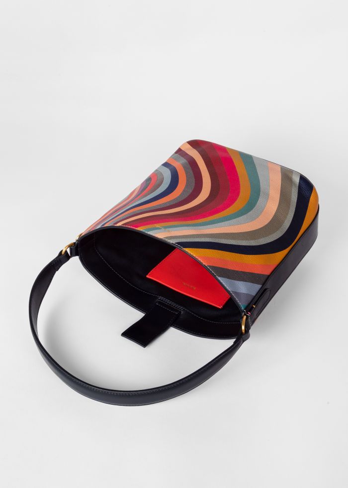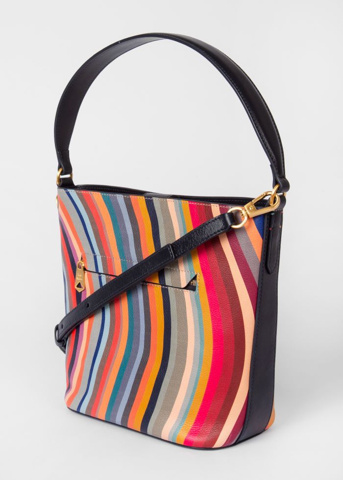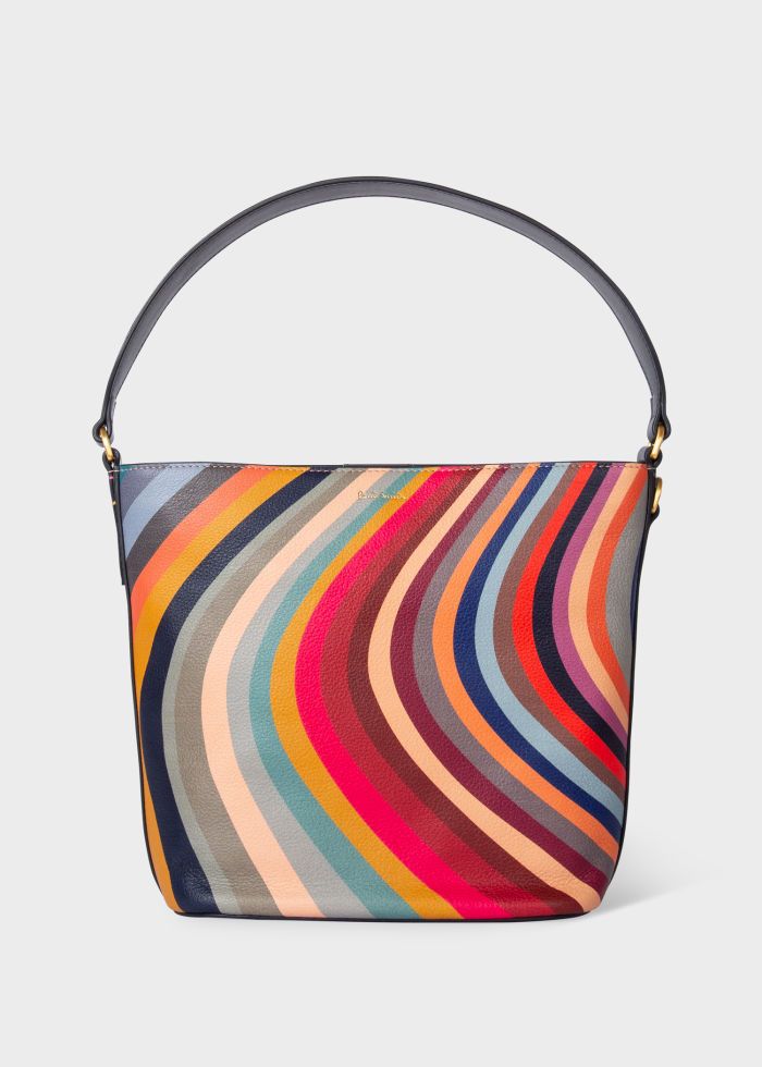 Compacte bucket bag in premium leer met de iconische Paul Smith ‘Swirl’. Stijlvol ontwerp met korte hengel en verstelbare schouderriem.