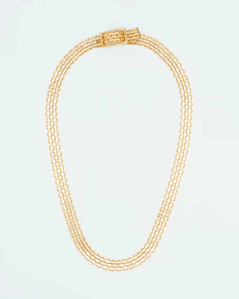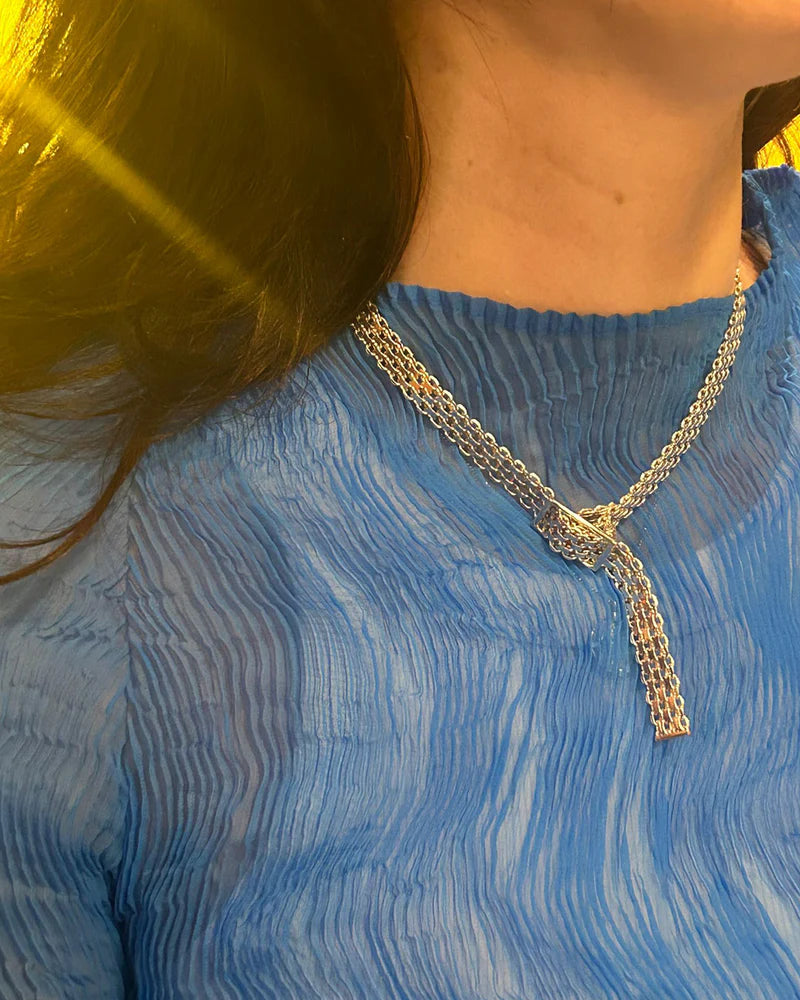 De ketting met gesp-sluiting uit La Parure de l’Incroyable weerspiegelt de veelzijdigheid van gravin Ratazzi, de rebelse salonnière en vrijdenker. Vervaardigd uit elegante, vloeiende schakels die de glans van klassieke rivières oproepen zonder stenen, kan deze ketting strak of los gedragen worden, naar eigen stijl en stemming. Een veelzijdig juweel dat je uitnodigt je eigen verhaal te schrijven. Met de hand gemaakt door onze goudsmeden in het Antwerpse atelier.