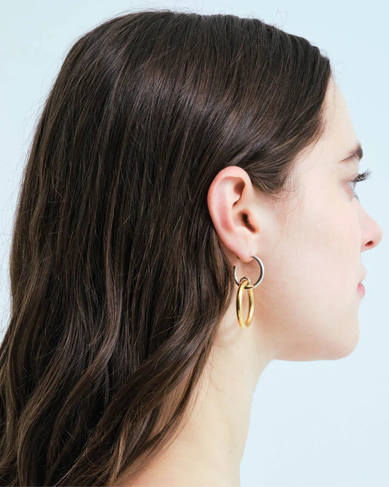 Deze dubbele creolen uit de collectie Les Éternelles onthullen de intrinsieke schoonheid van het materiaal door een speels contrast tussen zilver en verguld zilver. Het ontwerp grijpt terug naar essentiële vormen uit het begin der tijden. Als incontournables worden deze juwelen een deel van jou – tijdloze stukken om voor altijd te hebben en te houden. Elk stuk wordt met de hand vervaardigd door onze goudsmeden in het Antwerpse atelier.