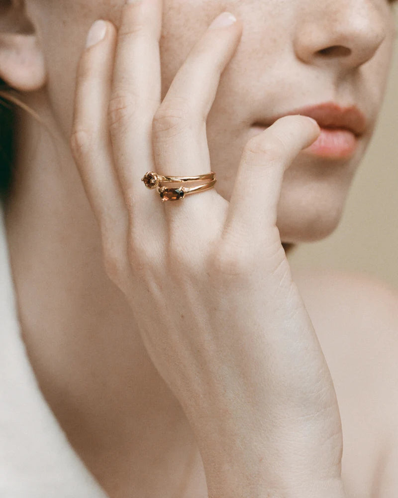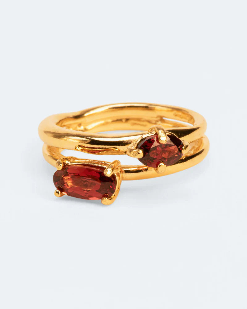 Deze organische ring van sterling zilver 925, bezet met een granaat, omarmt de vinger als een klein eerbetoon aan de natuur.