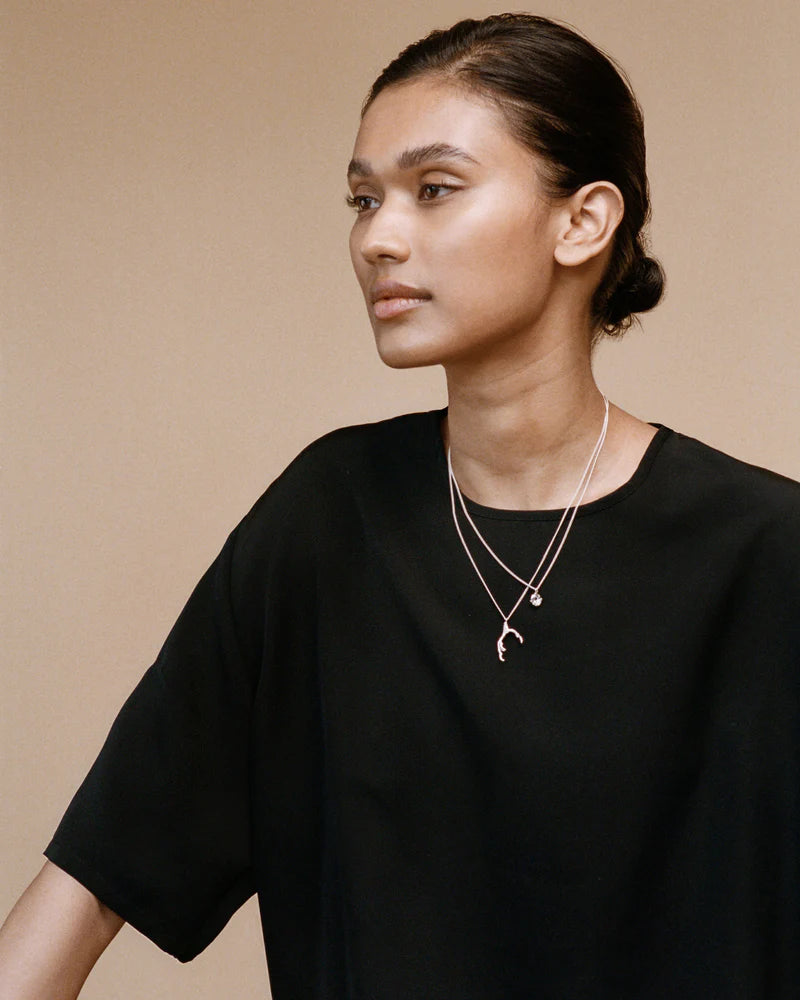 Onze iconische vogelpoot Grigri ontmoet de amethist in een dubbele ketting die harmonie en contrast tegelijk belichaamt. Krachtig als statementstuk, maar ook veelzijdig in combinatie met andere juwelen.