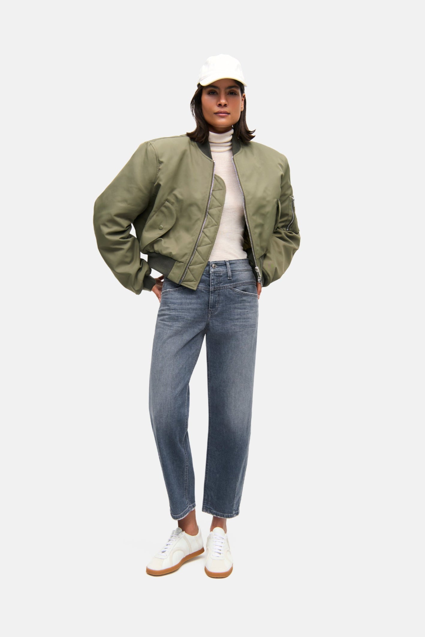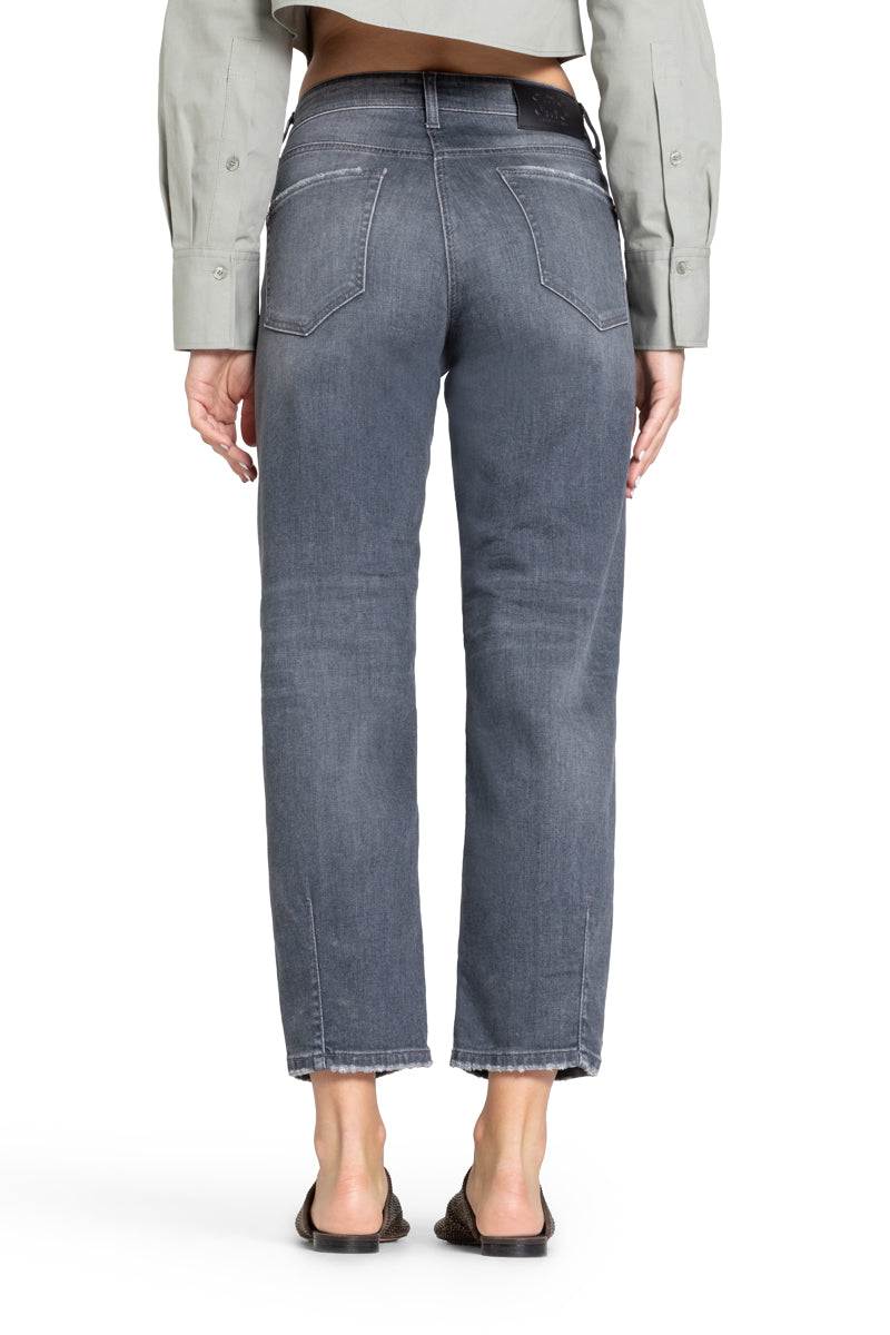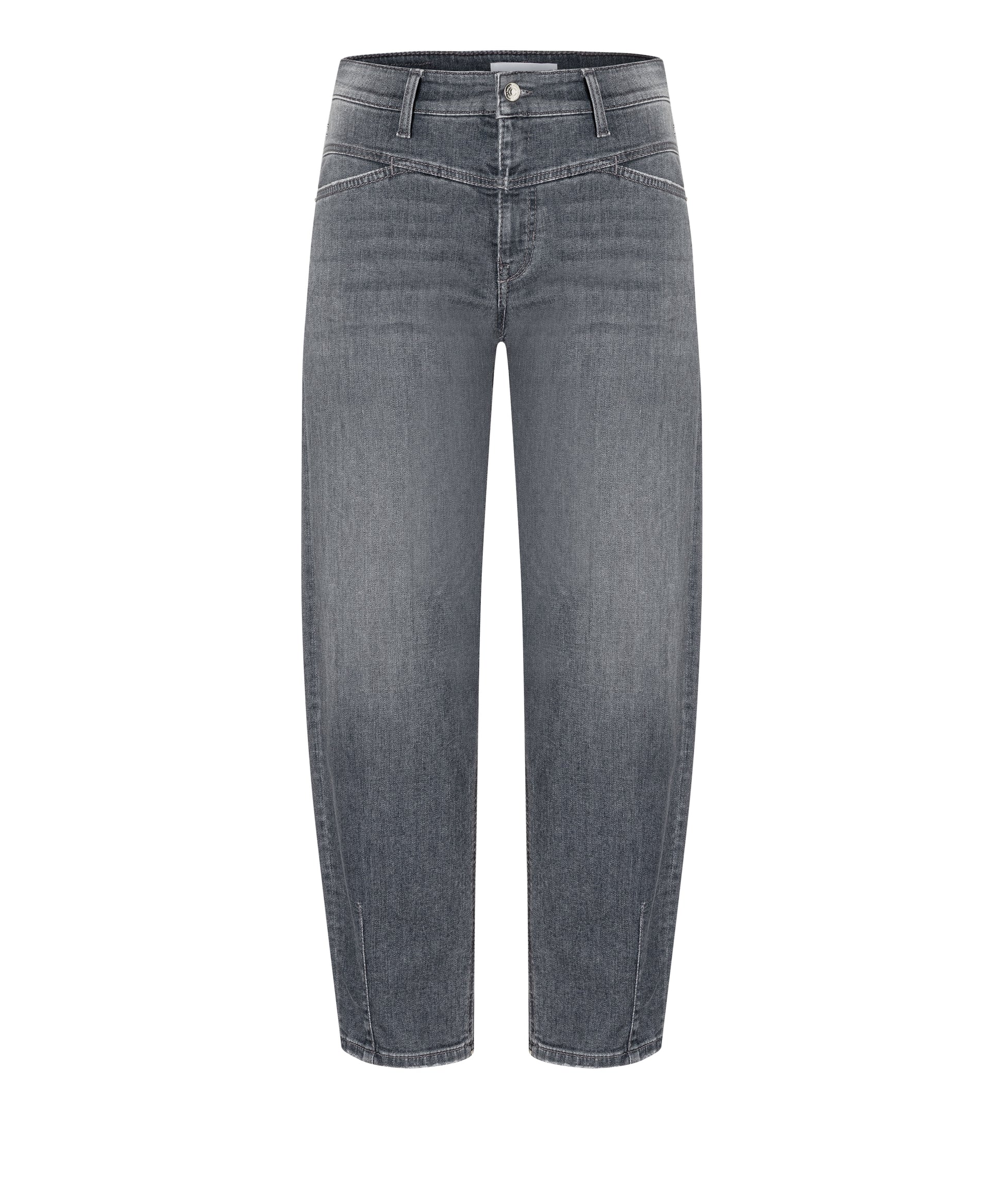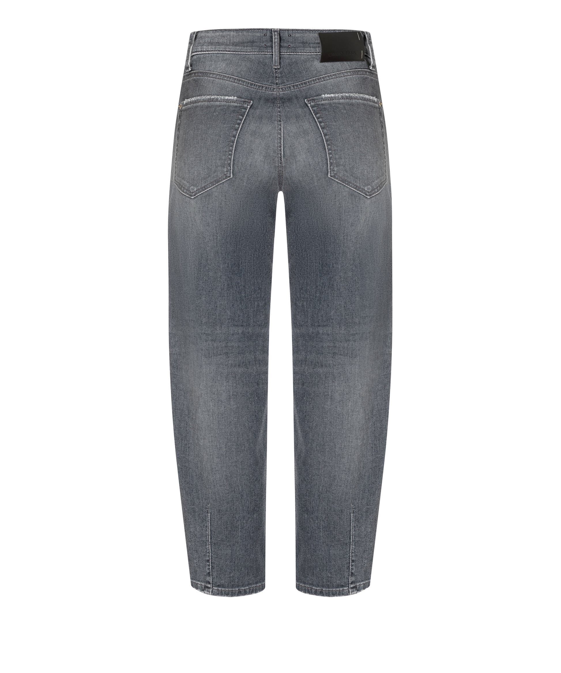 De Elin jeans in grijze wassing heeft een cropped O-shape met taps toelopende pijpen. Comfortabel stretchdenim voor een moderne look.