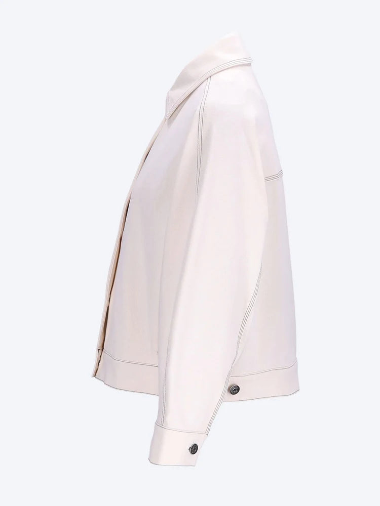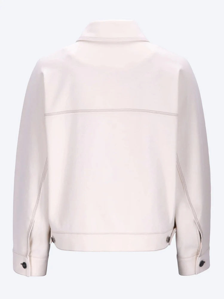 Kort ivoorkleurig jersey vestje met knoopsluiting, kraag en contrasterende stiksels. Elegant en modern, ideaal om licht en stijlvol te layeren.
