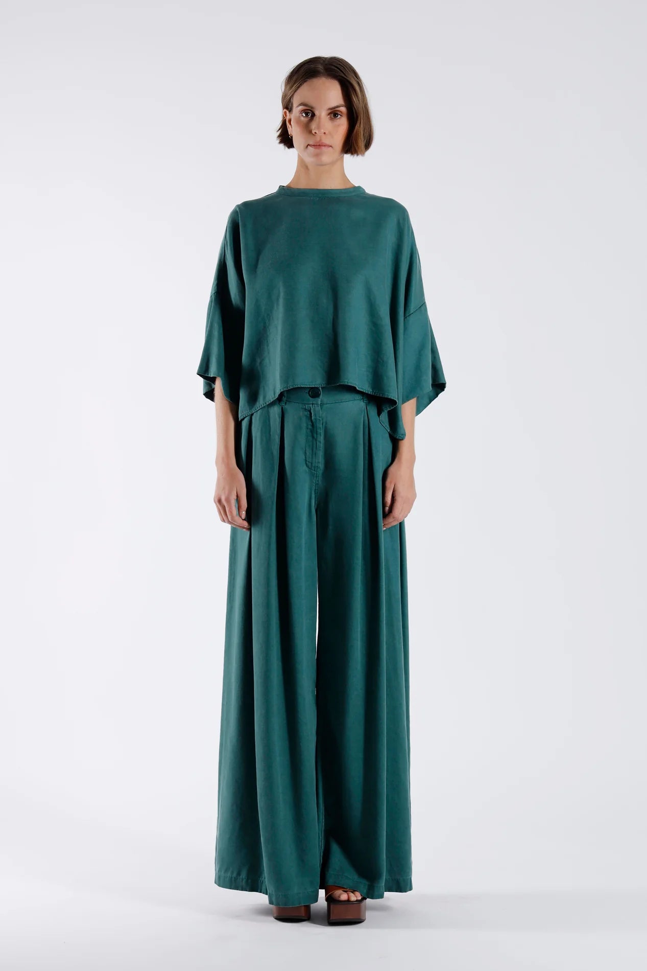Luchtige high-waist broek met dubbele plooien en extra wijde pijpen. Een elegante en comfortabele fit voor een verfijnde, vloeiende look.