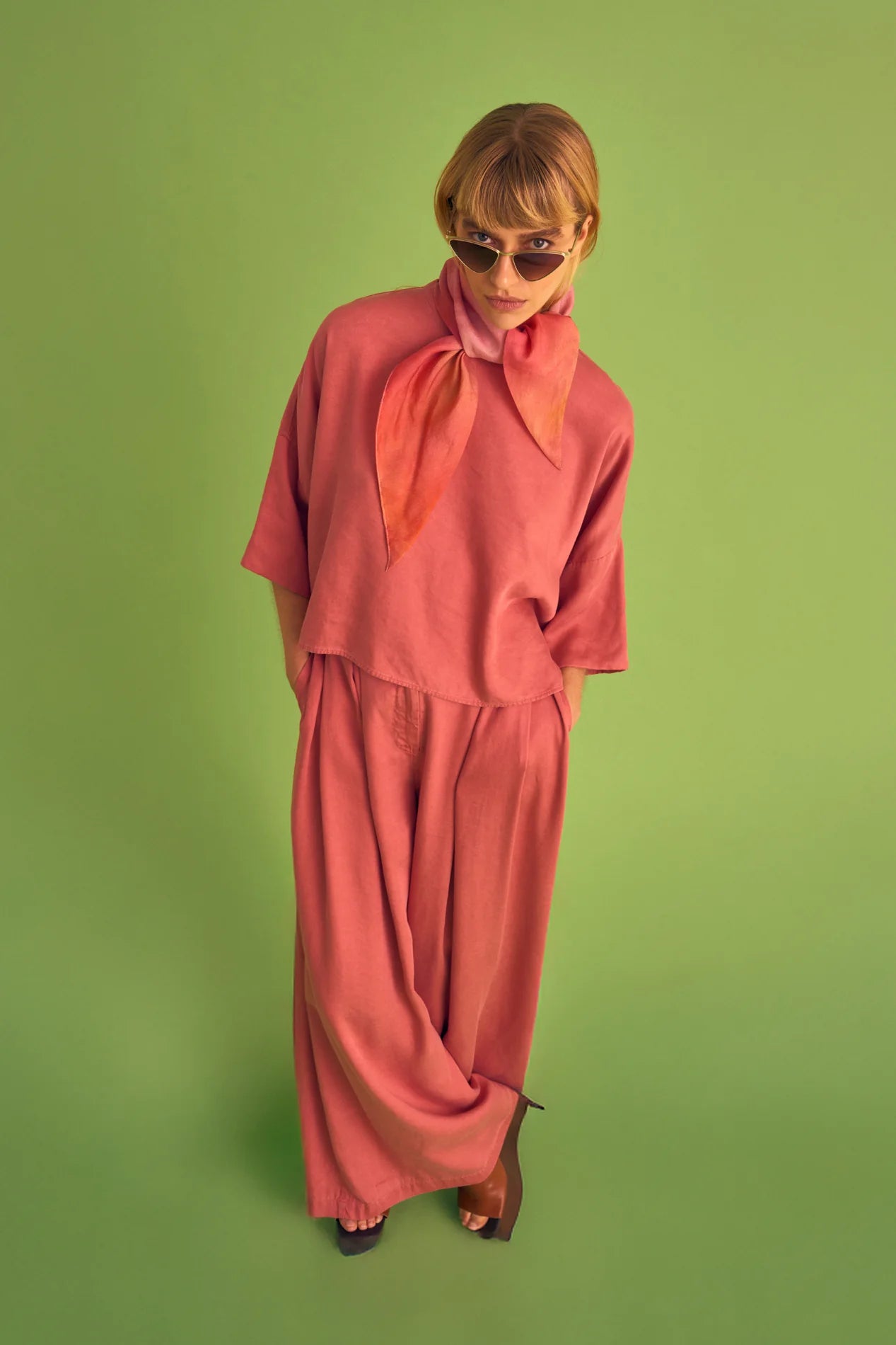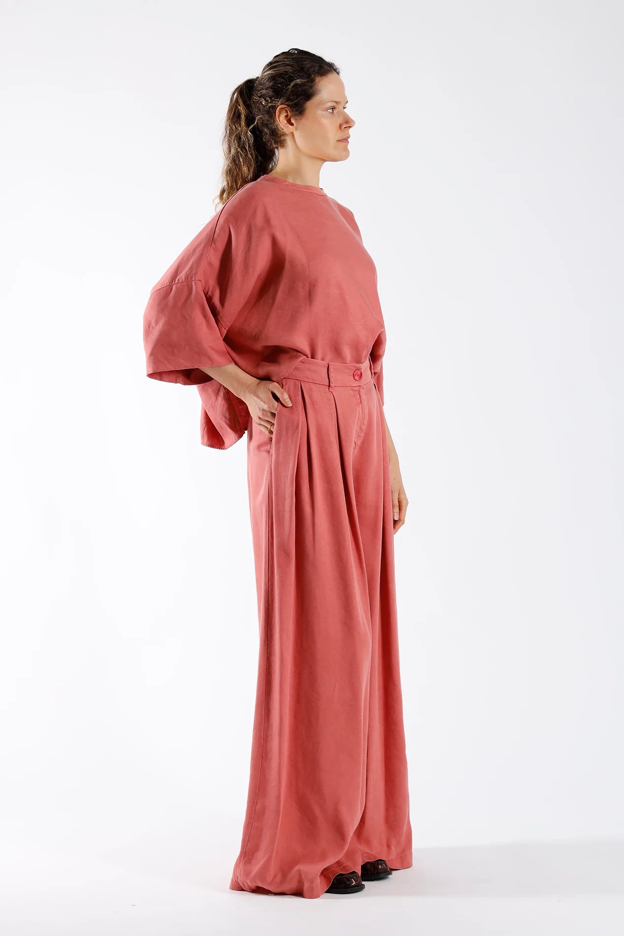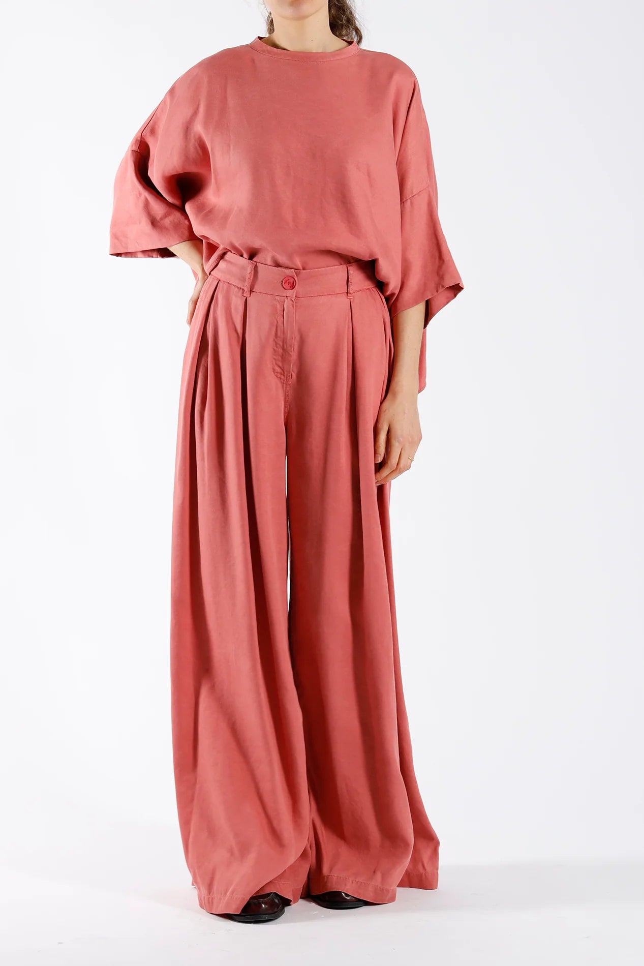 Luchtige high-waist broek met dubbele plooien en extra wijde pijpen. Een elegante en comfortabele fit voor een verfijnde, vloeiende look.