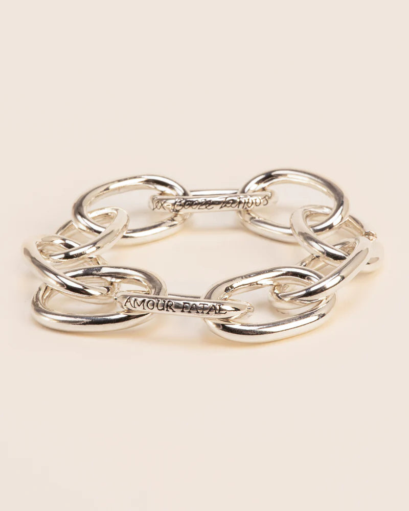 Wouters & Hendrix koesteren een bijzondere liefde voor de punkperiode. De energie en attitude uit die tijd keren regelmatig terug in hun collecties, onder meer in de vorm van schakelkettingen en armbanden. In Les Éternelles maakt de schakelarmband uit de collectie I Love to Run, Garden and Crochet (2001) een comeback. De zware schakels dragen een intieme boodschap: Amour fatal, gegraveerd in zilver. Als speelse tegenhanger fluistert het ondeugende drietal Sex, Booze, Tattoos dat je fatale liefde misschien niet té serieus moet nemen.