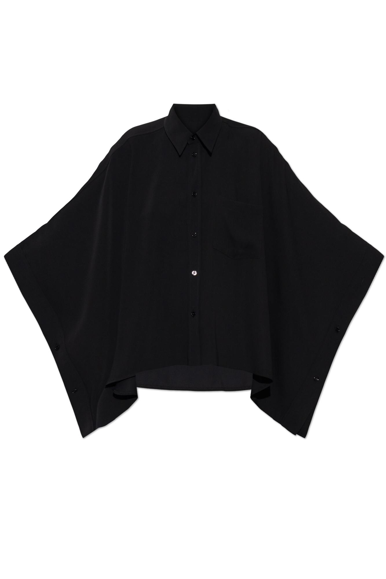 Dit loose-fit hemd maakt een sterk statement met zijn poncho-achtige vorm en volumineuze mouwen. Avant-garde, nonchalant en verfijnd tegelijk.