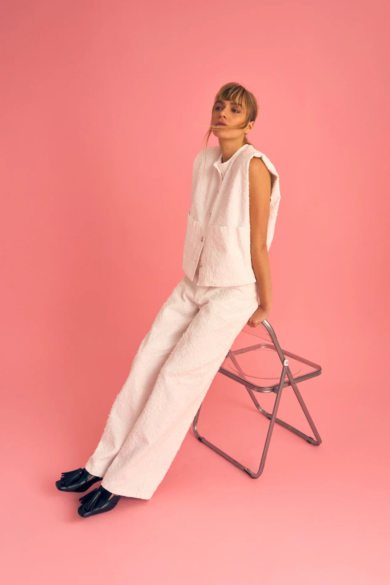 Denim broek met textuur en klassiek vijfzakkenmodel. De hoge taille en rechte, wijde pijpen zorgen voor een modern en krachtig silhouet.