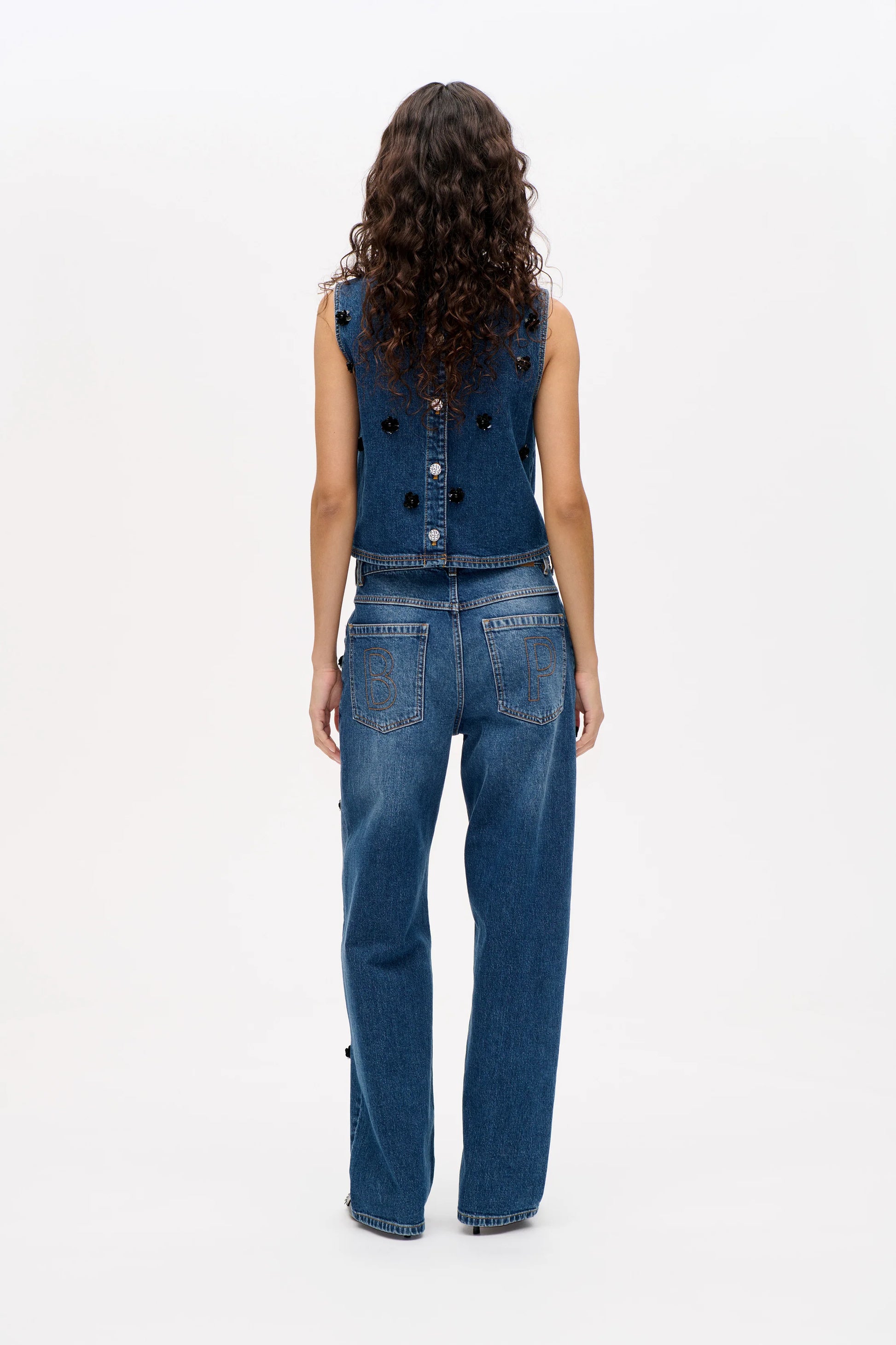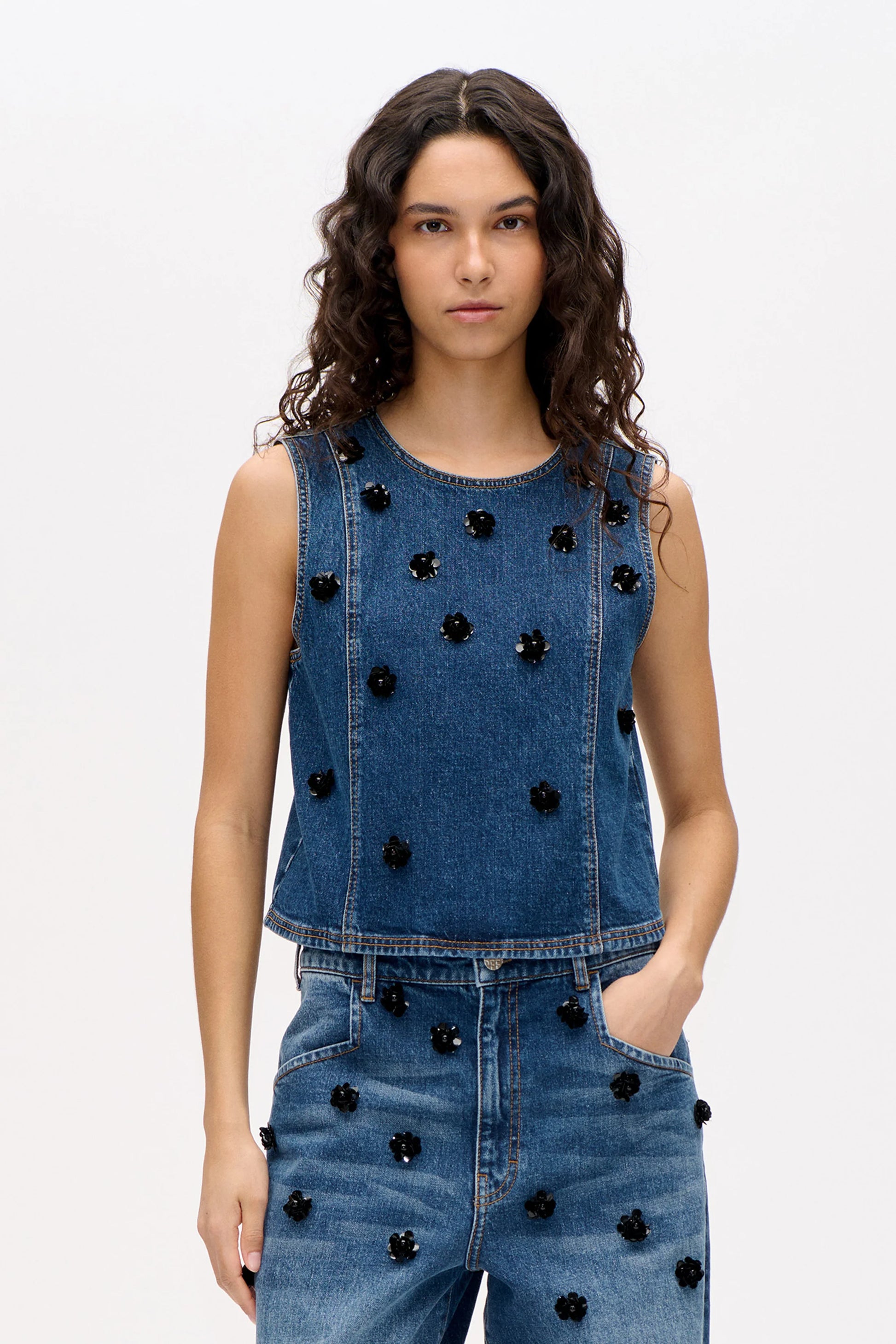 Madine Top in biologisch denim met paillettenbloemen: een cropped, mouwloos model dat klassiek en glamour moeiteloos combineert.