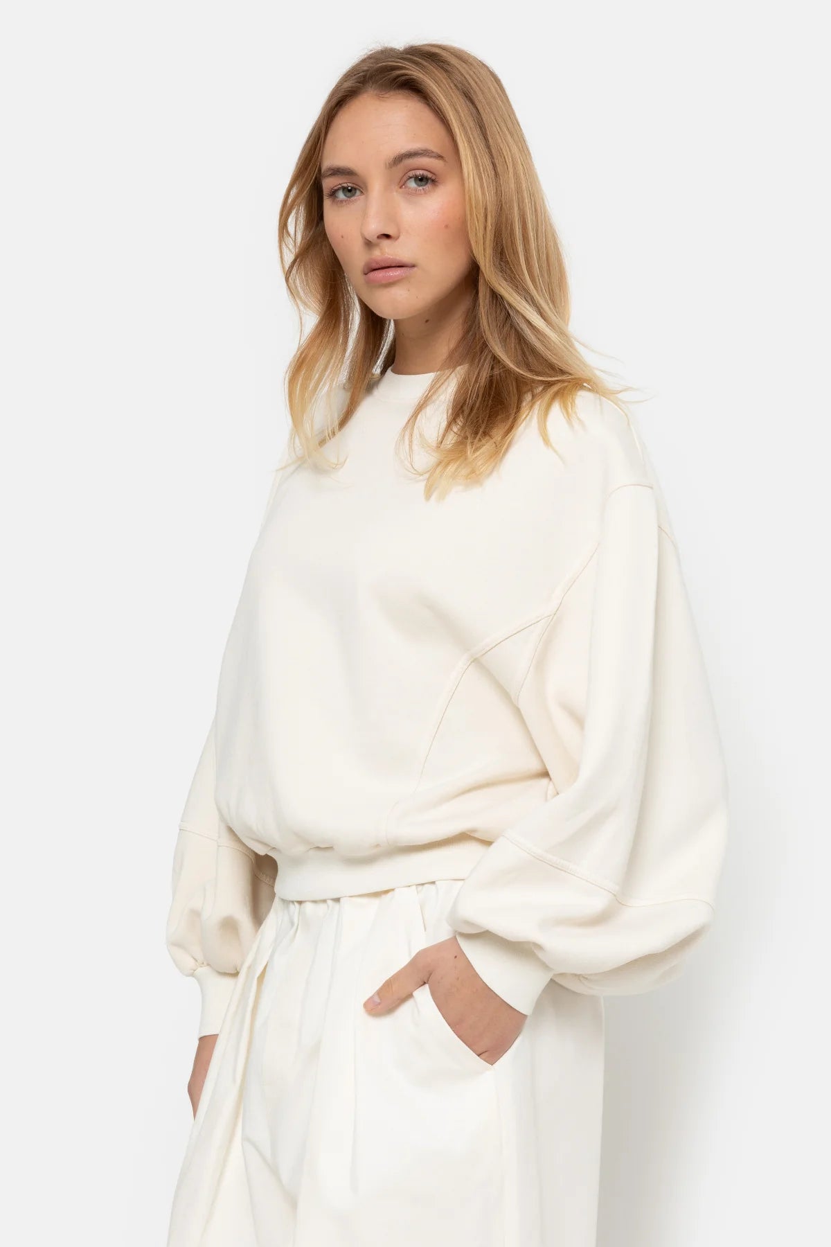 Sweater met subtiele pofmouwen in een zachte, dikke sweatstof. Losvallend en stijlvol, perfect voor laagjes tijdens frisse herfst- en winterdagen.