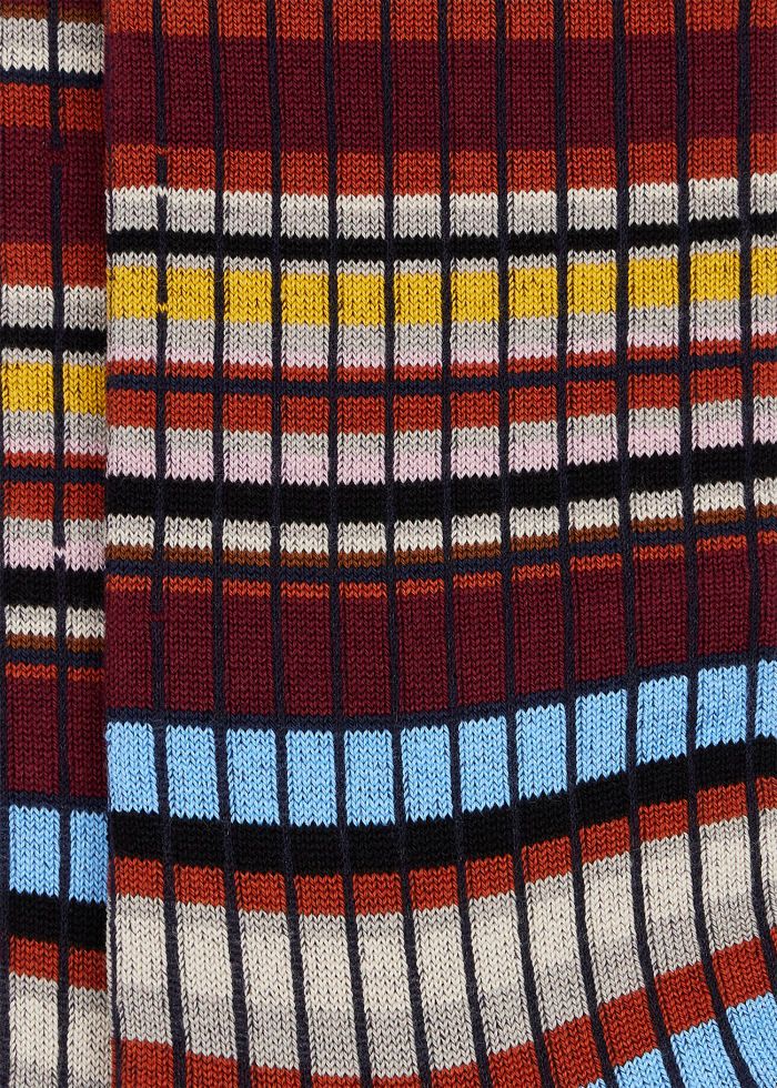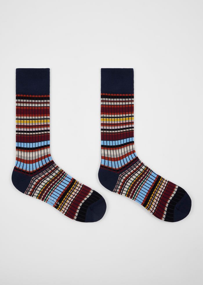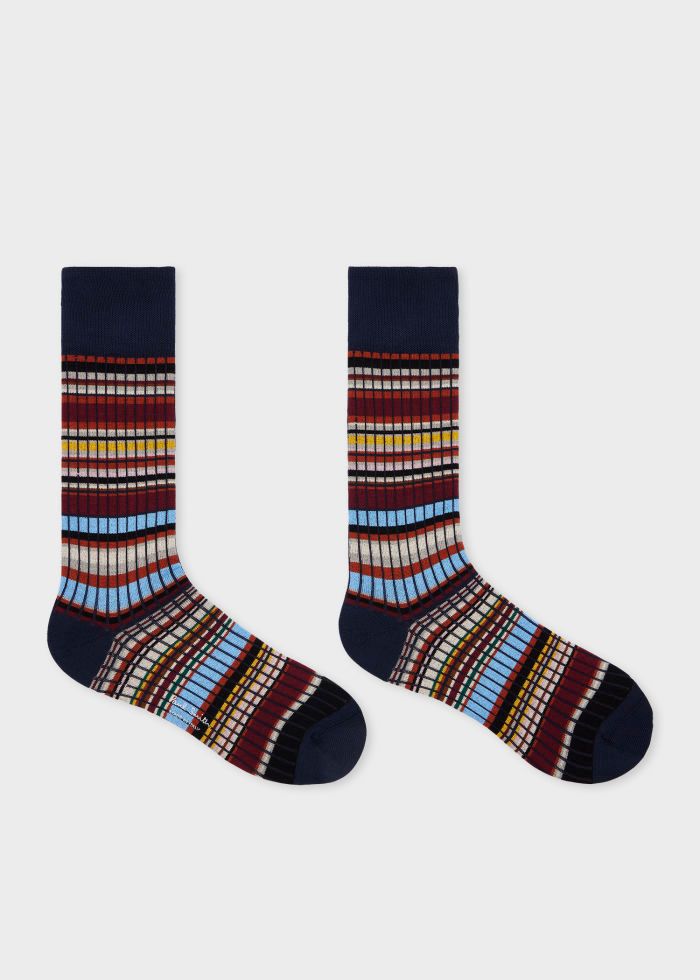 Navy sokken met iconische Signature Stripe en ribstructuur, gemaakt in Italië. Afgewerkt met blauwe hiel, teen en boord voor een kleurrijk detail.