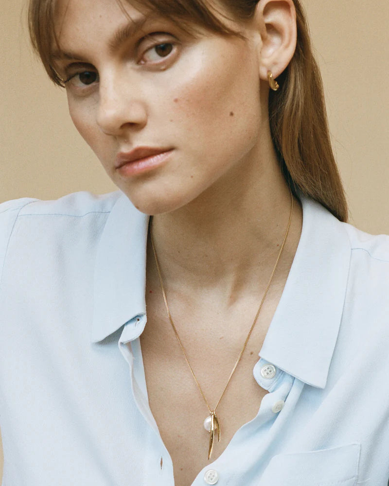 Een imperfecte parel en zilveren bladeren komen samen in organische harmonie. De collectie Voyages Naturalistesontstond uit een fascinatie voor de natuur en probeert het steeds veranderende te vangen en te vertalen naar een draagbare herinnering. Elk stuk wordt met de hand vervaardigd door onze goudsmeden in het Antwerpse atelier.