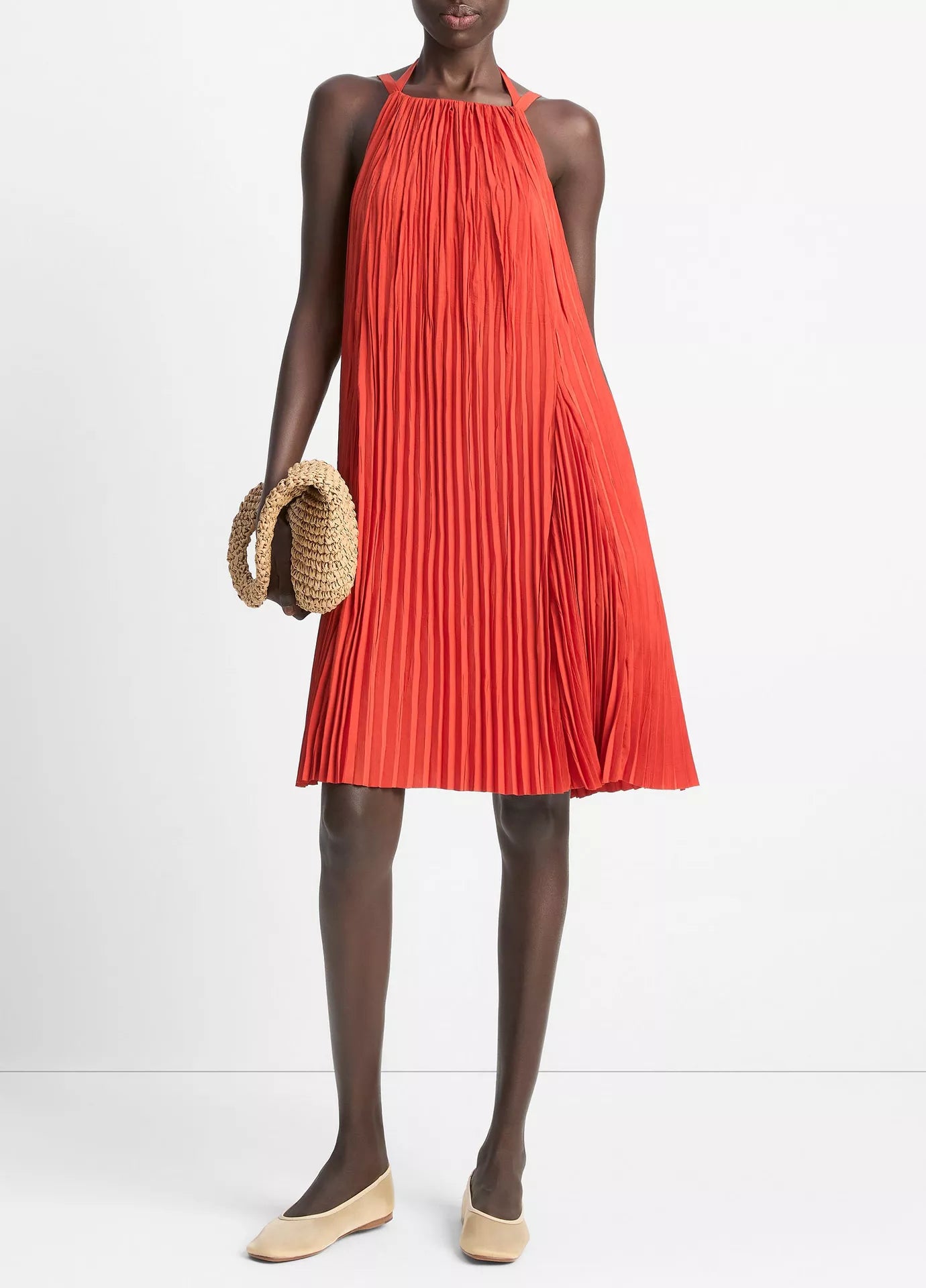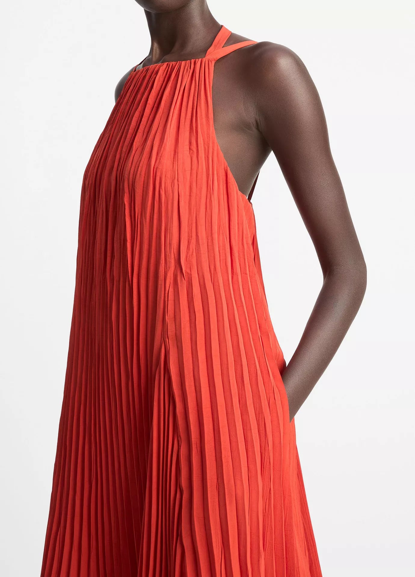 Lichte A-lijn jurk met plooien rondom en verstelbare halter. Beweegt sierlijk mee en heeft handige zijzakken. Makkelijk en elegant tegelijk.