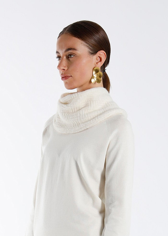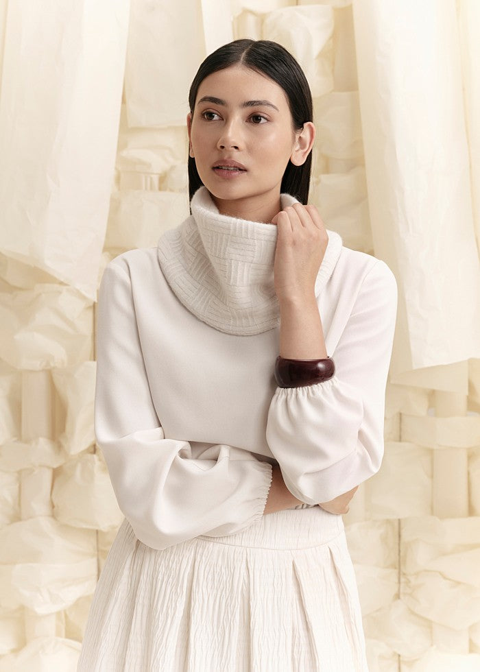 De kraag Pitti is een stijlvol alternatief voor een sjaal. De kraag sluit met twee knoopjes en kan langs beide zijden gedragen worden. Pitti geeft een winterse toets aan blouses, jurken of de Pessera gilet dankzij de bijpassende textuur.