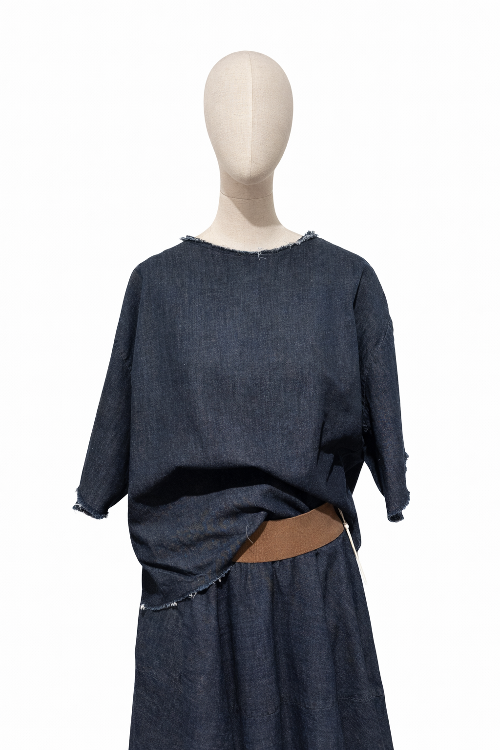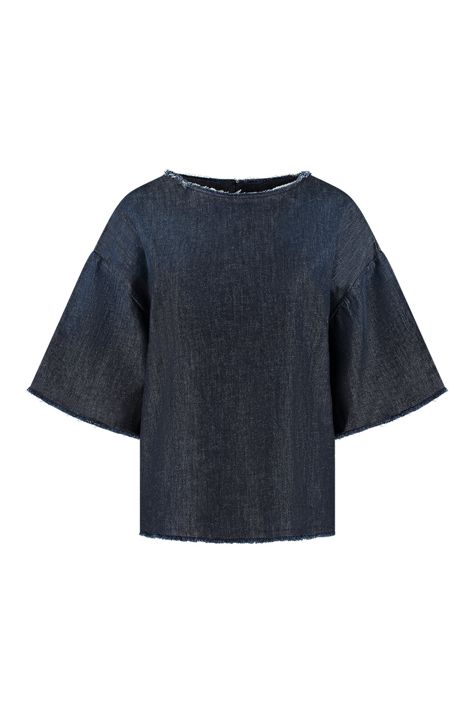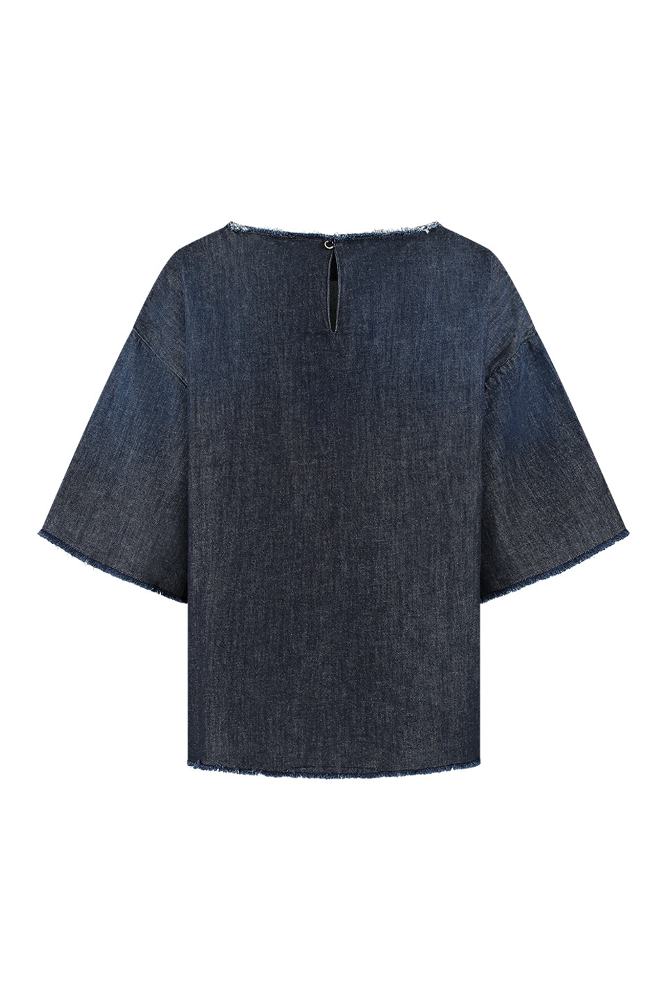 Denim blouse met korte mouwen en subtiele rafelranden. De rechte snit en het kleine splitje met knoopje achteraan geven een nonchalante, moderne uitstraling.