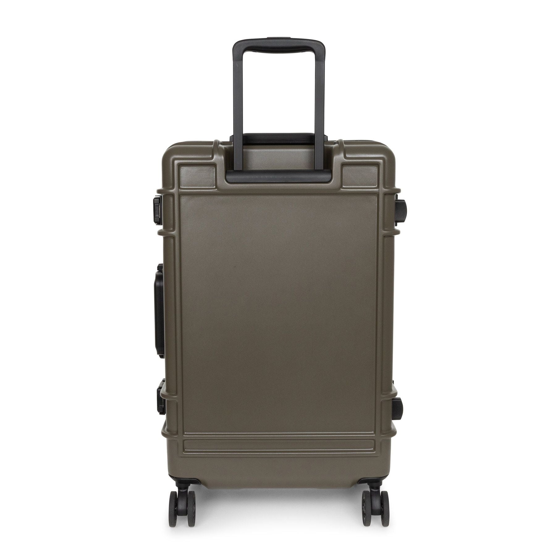 Deze middelgrote hardschalige trolley in Army Olive groen biedt stevigheid en voldoende ruimte voor langere reizen.
