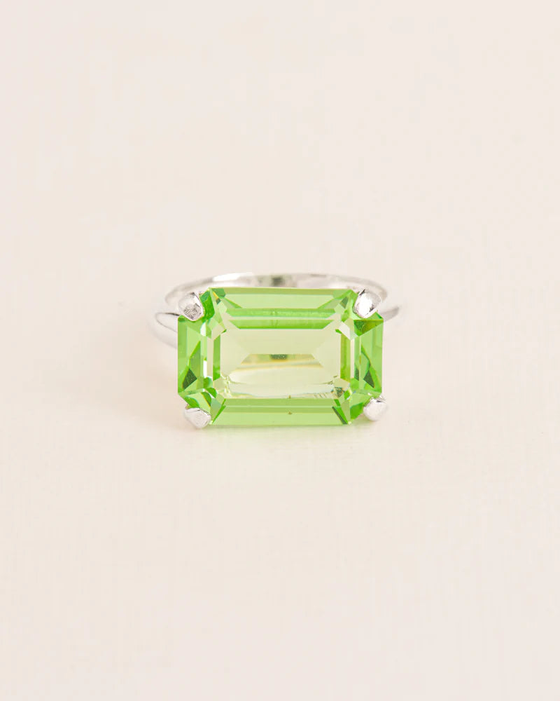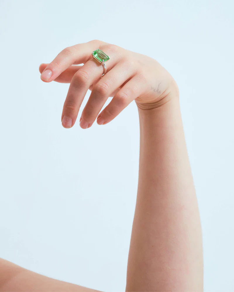 Deze sterling zilveren ring is een eerbetoon aan het materiaal en het archetypische juweel. De zetting laat de peridoot het licht vangen, terwijl het ontwerp in zijn eenvoud toch krachtig aanwezig blijft.
