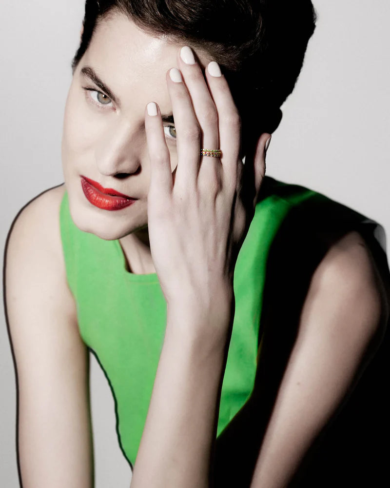 Saffieren en diamanten wisselen elkaar af in een speels ritme dat het subtiele spel tussen licht en schaduw weerspiegelt. Deze 18 karaat gouden ring is een speelse ode aan de kunst van verfijning, een gefluisterde betovering die je hand siert. Uit La Fête des Bêtes, een eminente collectie van draagbare ‘objets bouleversants’ die op luchtige wijze hulde brengt aan het surrealisme.