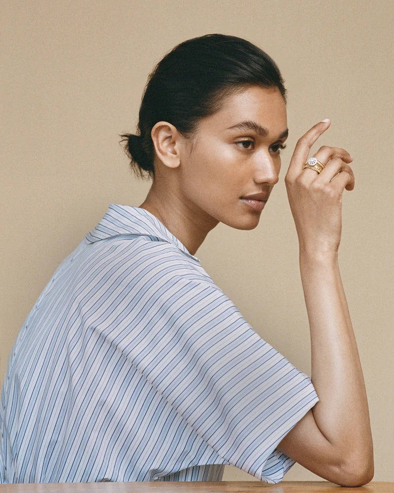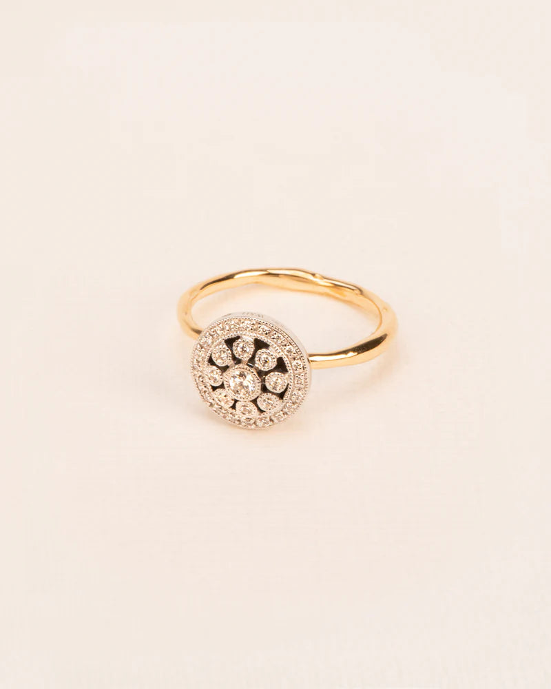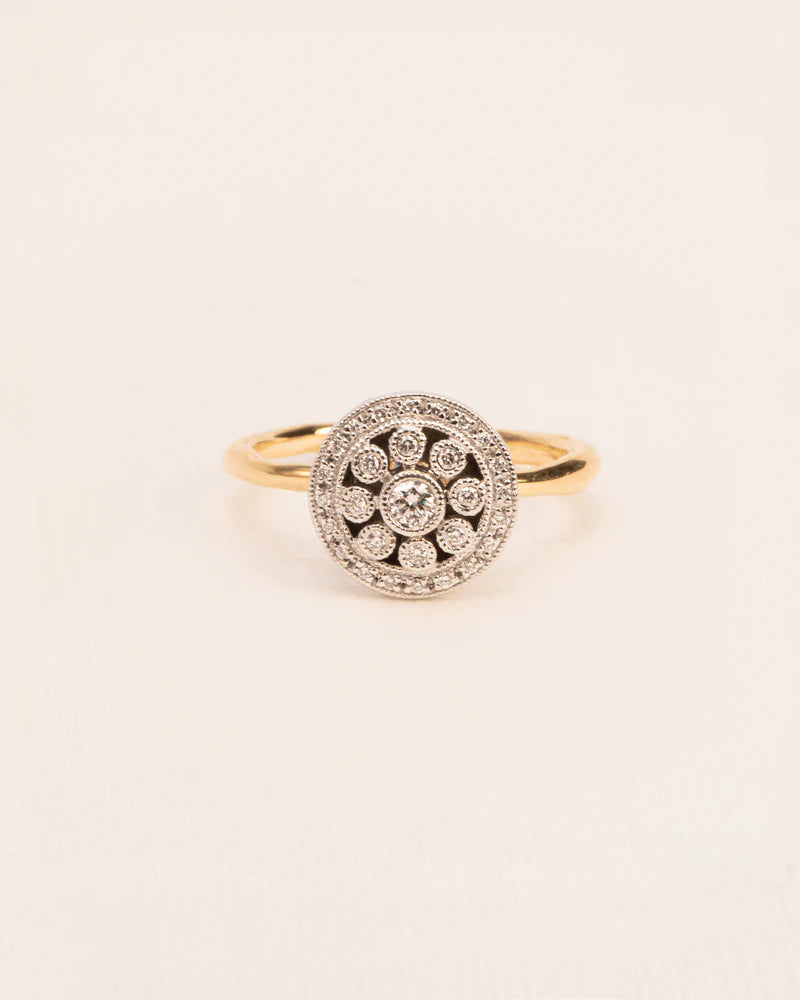 Een diamanten rozet die je vinger siert. De klassieke millegrain-techniek, genoemd naar de duizenden korrels waarin de stenen worden gezet, geeft dit stuk een verfijnde uitstraling. Het delicate lijnenspel contrasteert met de organische ring waarop de rozet rust, terwijl het gerhodineerde gouden oppervlak de schittering van de diamanten versterkt. Contrasten verkennen en verenigen is een speels kenmerk van Wouters & Hendrix, ook in dit iconische ontwerp uit de Voyages Naturalistes collectie, met de hand vervaardigd in ons Antwerpse atelier.