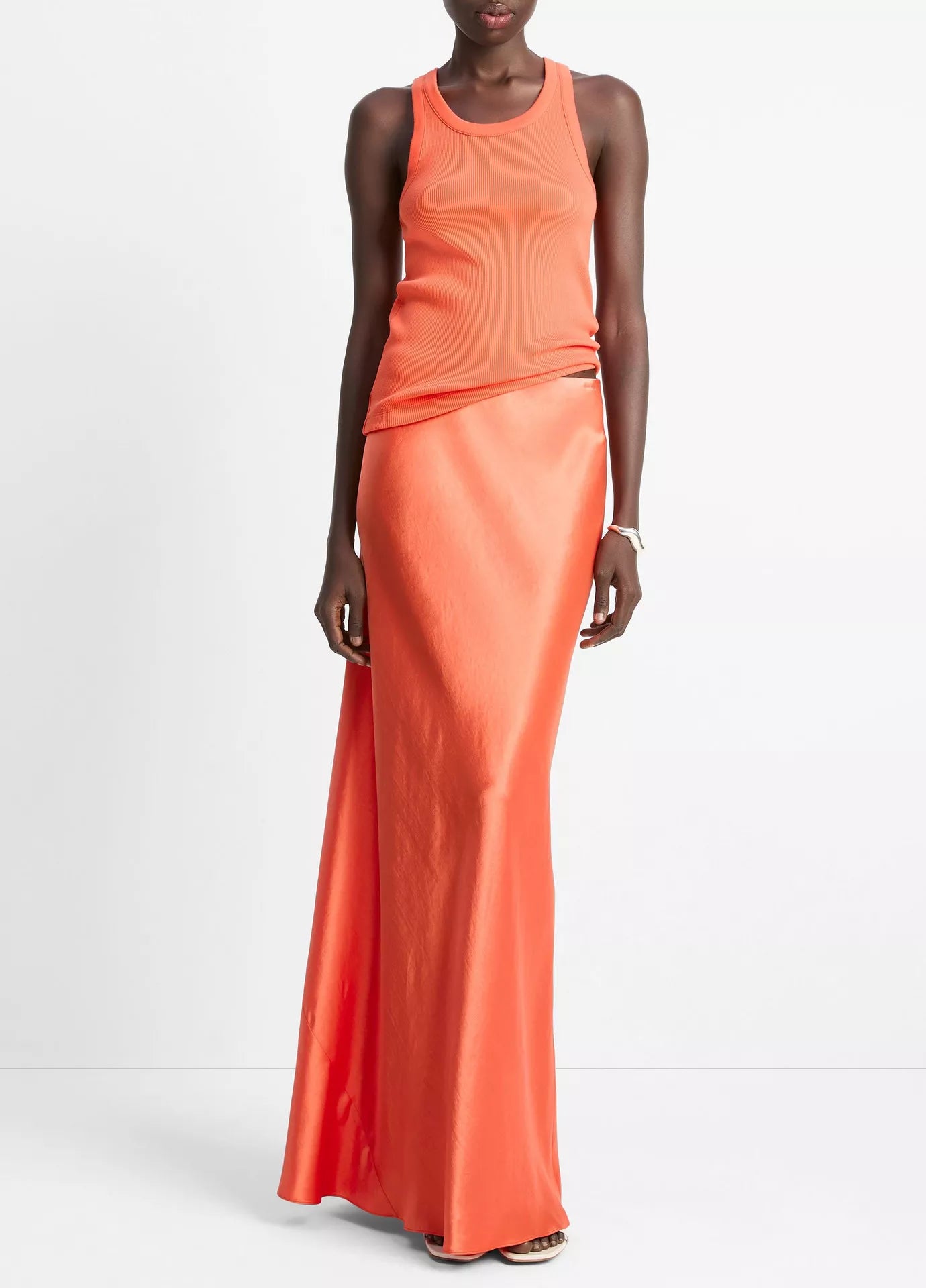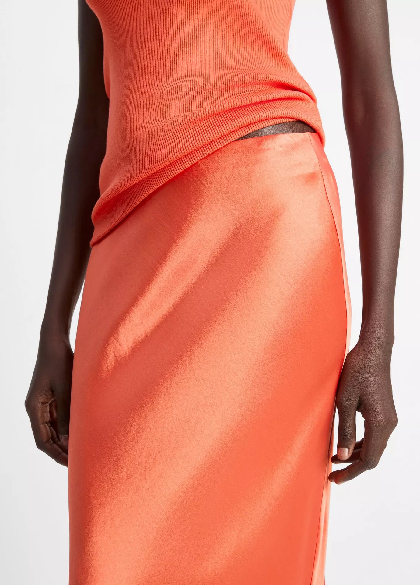 Maxi-rok in glanzende Japanse Naia™ Renew satijn, met lichte sleep en sierlijke beweging. Elegant, vrouwelijk en duurzaam geproduceerd.