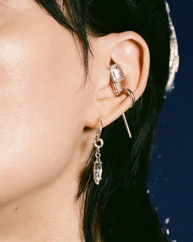 In deze Midnight Children hoop earring treedt de veerringsluiting op als kostbaar element, terwijl een marquize geslepen kristal knipoogt naar nachtelijke lichtflitsen. De zilveren afwerking echoot zwart-wit scènes na het donker. Elk stuk is met de hand vervaardigd door onze goudsmeden in ons Antwerpse atelier en straalt unieke kunstzinnigheid uit.