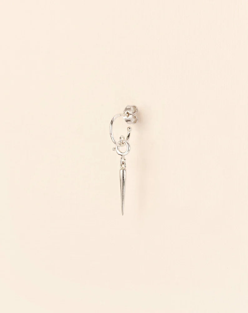 In deze spike hoop earring treedt de veerringsluiting in de schijnwerpers als kostbaar element. De zilveren afwerking versterkt de kracht van zwart-wit contrasten, als echo’s van scènes na het donker. Elk stuk wordt met de hand vervaardigd door onze goudsmeden in het Antwerpse atelier en ademt een unieke kunstzinnigheid.