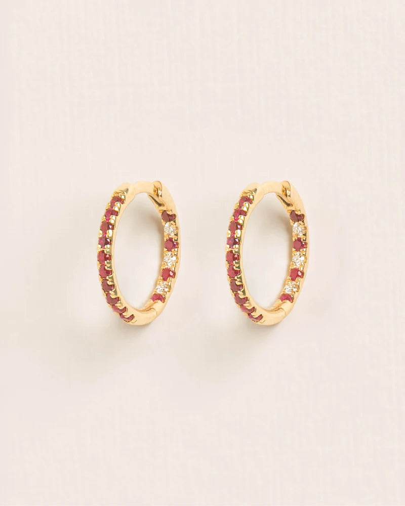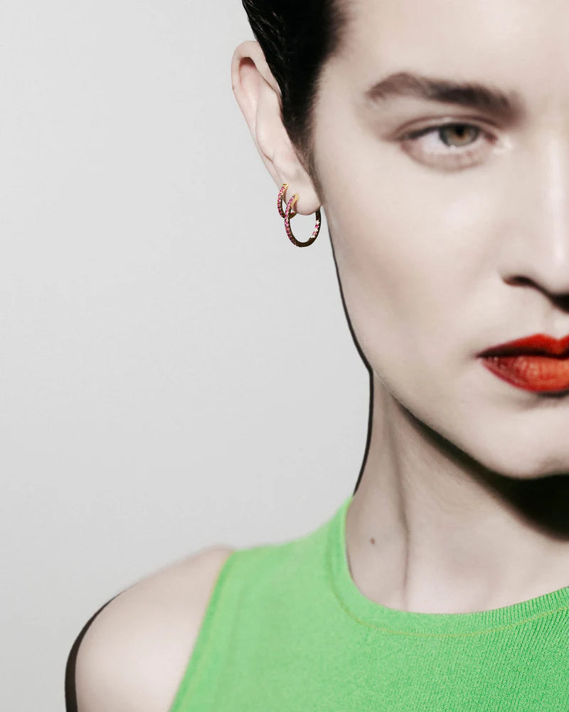 Soms begint vernieuwing met een kinderlijke vraag: waarom moeten hoops er vanbinnen hetzelfde uitzien als vanbuiten? Het antwoord: dat hoeft niet. Deze 18 karaat gouden kleine hoops zijn vanbinnen bezet met robijn en diamant die betoverend licht vangen bij elke beweging, terwijl de buitenzijde fonkelt met robijn voor een schittering vanuit elk perspectief. Een speels stuk uit La Fête des Bêtes, onze draagbare ode aan surrealistische verwondering.