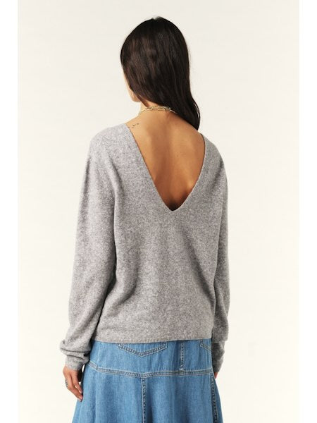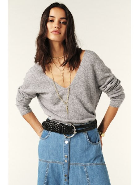 Zachte wollen trui met V-hals voor- en achteraan. Elegante snit met fijne ribboorden aan mouwen en zoom voor een verfijnde, vrouwelijke look.