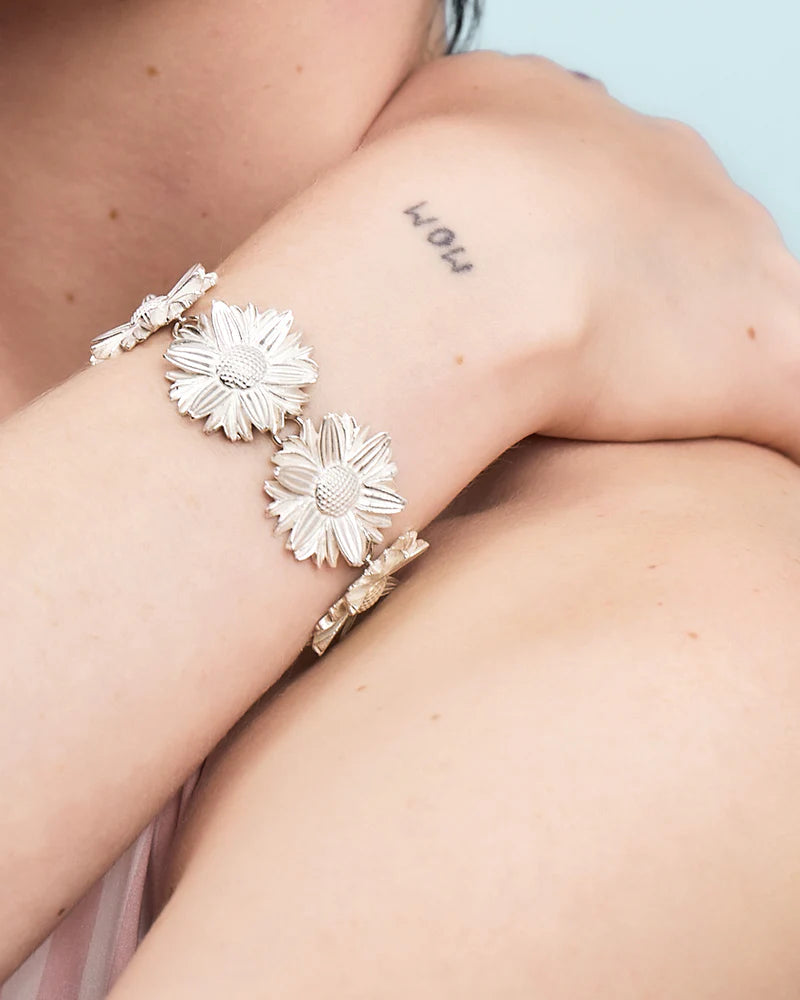 Deze opvallende armband met zilveren en gouden madeliefjes vangt de speelsheid van een eeuwige zomer. Elk detail wordt met de hand vervaardigd door onze goudsmeden in het Antwerpse atelier, waardoor een uniek stuk ontstaat dat zowel vrolijk als verfijnd is.