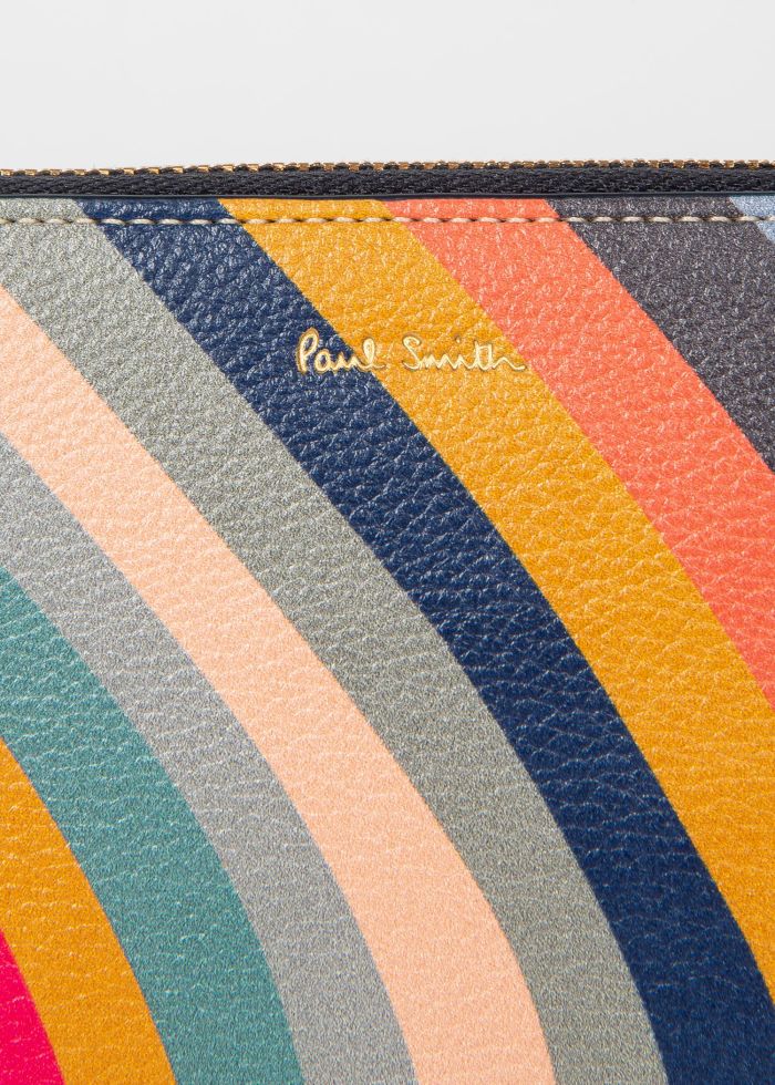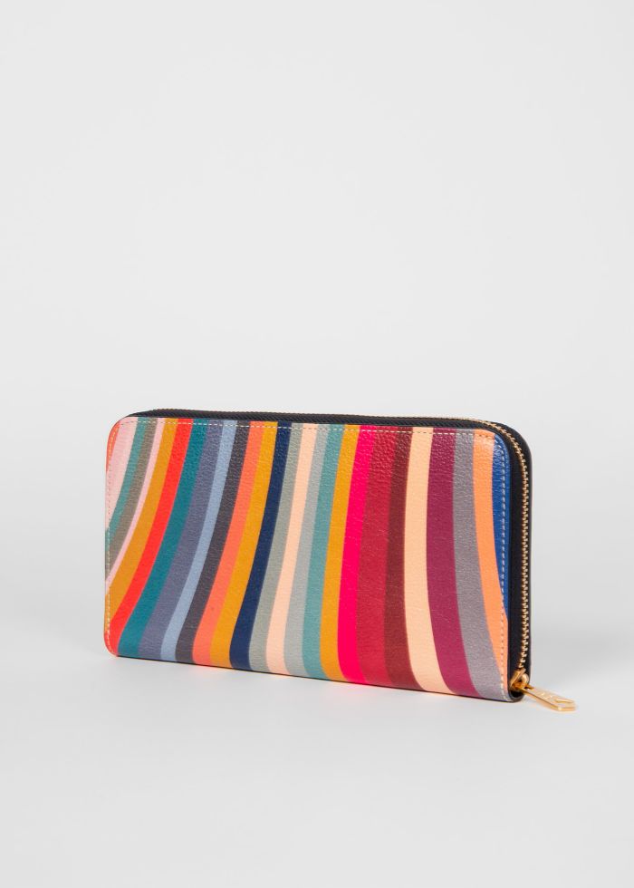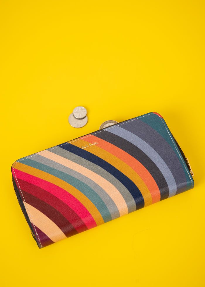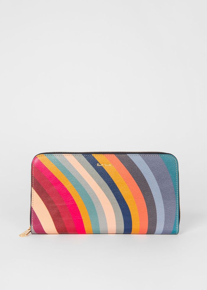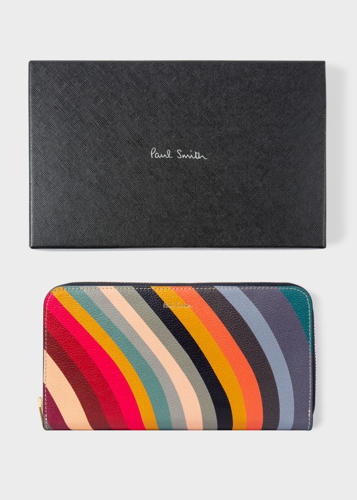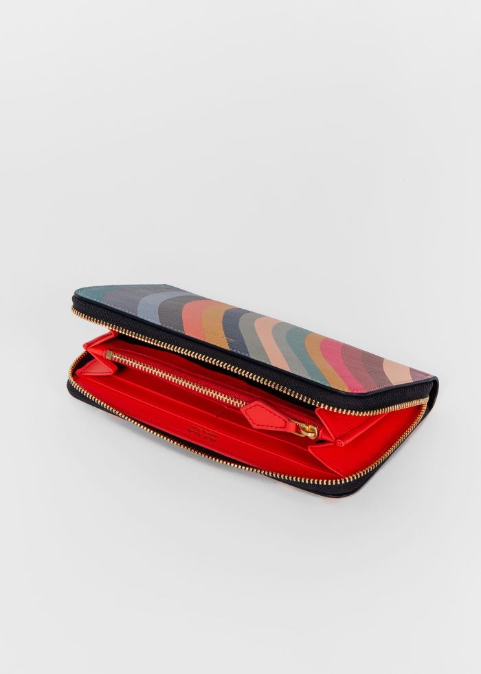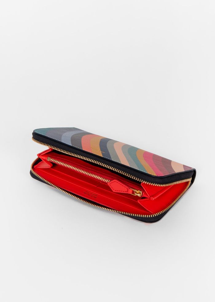 Deze ruime lederen portefeuille met swirl-print combineert stijl en functionaliteit met een veilige ritssluiting, kaartsleuven en een muntvak.
