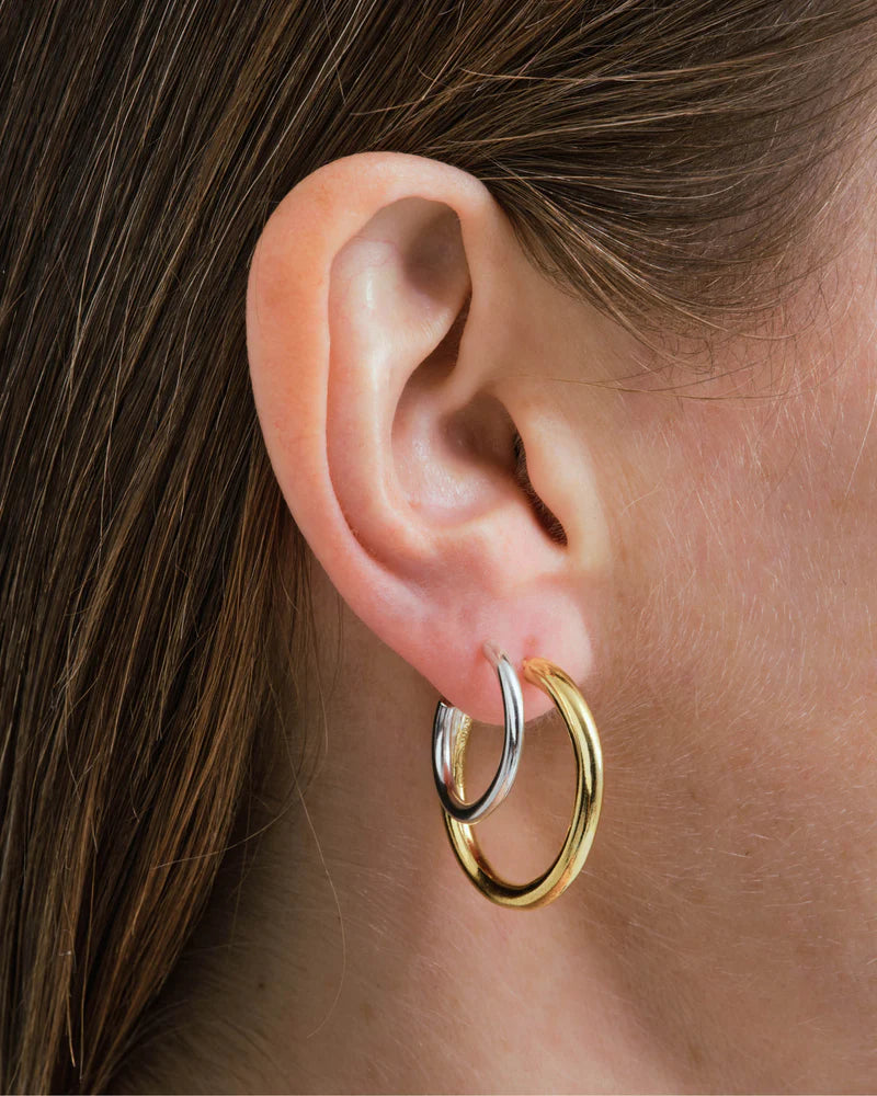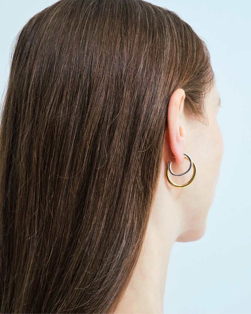 De ontwerpers van Wouters & Hendrix doorbreken de regels van traditioneel juweelontwerp door niet alleen zilver en verguld zilver te combineren, maar ook aan elke oorbel een dubbele creool toe te voegen. Dit creëert een trompe-l’oeil-effect dat het oog verrast. Als subtiele rebellen met een liefde voor surrealisme zoeken we steeds naar onverwachte combinaties van materialen en technieken, en tooien we het lichaam met verhalen in zilver en goud.
