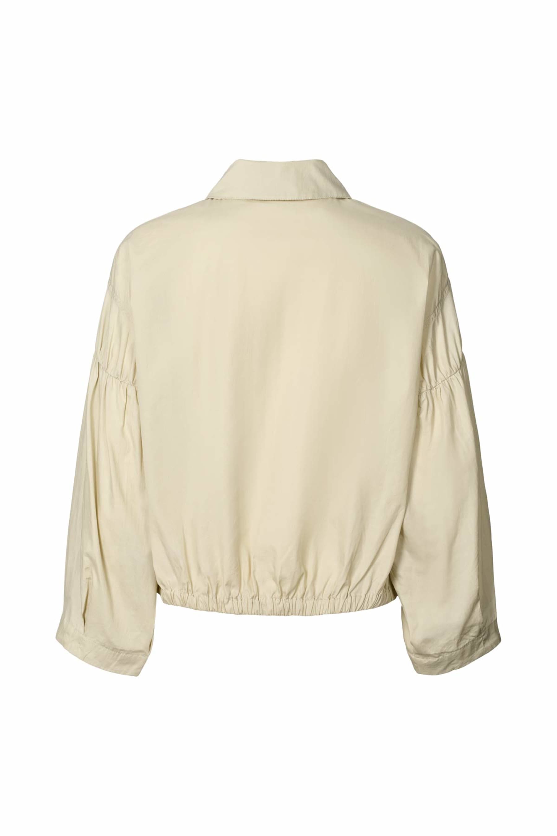 Cropped pasvorm met elastische plooien aan mouwen en zoom. Valt normaal; neem een maat groter voor meer volume. -