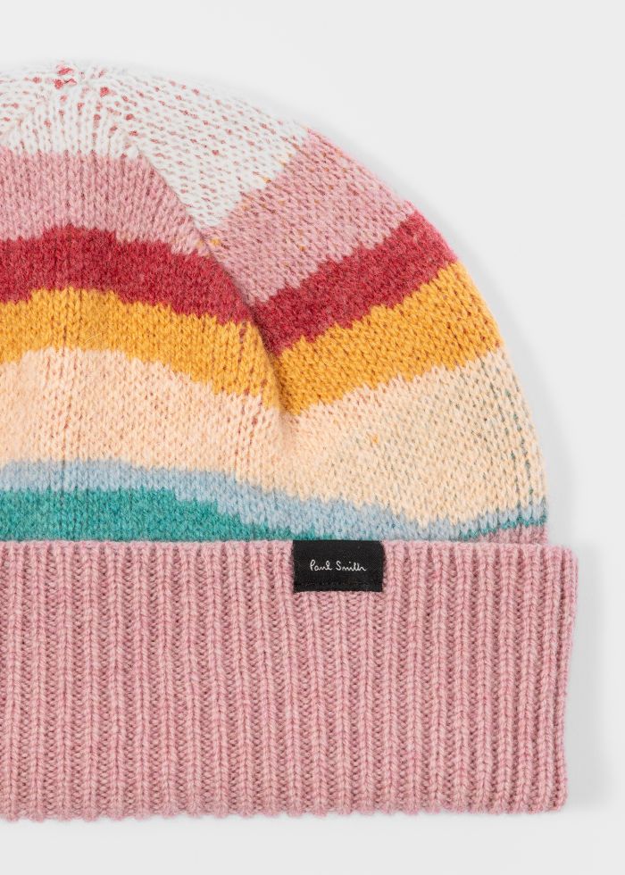 Roze ribgebreide beanie van zachte lamswol, met iconische Swirl-details. Voorzien van omgeslagen rand en Paul Smith signature tab.